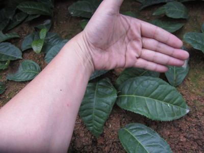 云南大叶种的茶树叶面积是指≥40~60平方厘米之间的茶树品种的统称,而此茶树叶面积大的可达60平方厘米以上,在浙江可称是一种新的发现。