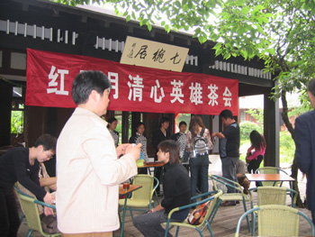 《茶语清心论坛》推出-----红五月清心英雄茶会于2005年5月15日在西子湖畔举行,在这春意盎然,绿叶浓荫,百花争艳的季节里,组织者选择了一清雅的品茶盛地,吸引着北京、上海、温州、杭州、台湾、安吉、开化等地的茶人及路过的游人,总舵主胡女士表示:“希望前来参加茶会活动的茶友们,一边品茶,一边交流,最后祝这次茶会活动圆满成功。”公刘子茶道苑的胡旭英茶师、慧洁等携带公刘子茶道专用茶空山新雨参与了茶会活动。