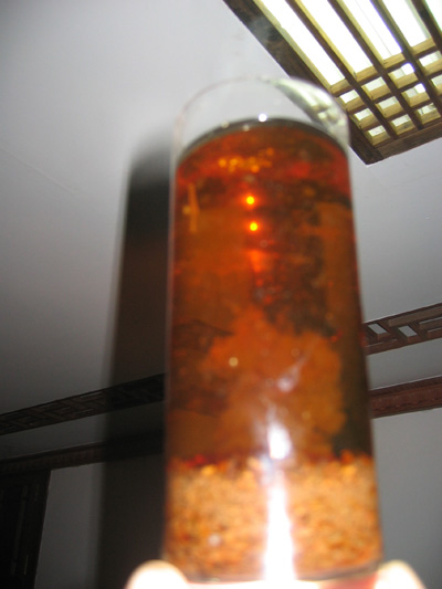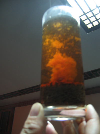 秋夜,没有了夏日的炎热,感觉真好,外面下着雨,聆听着雨声,一边工作,一边喝着茶。茶淡了,然而手边的工作还没有做完。随手拿了直升杯泡了一种奇特的茶,有雨声相伴,忙中有乐,正要喝茶的时候却发现杯内的茶汤起了变化,茶汤里竟然出现了磨菇云,于是想与更多的茶友一起分享这不经意间的发现所带来的愉悦心情。